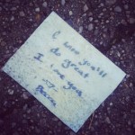 Apparently there are almost no weeks I don’t find something interesting on the sidewalk—this time a cute note. I also got a cute note, but mine came in the mail. Cisco and I both relaxed on the weekend, him on the couch mixed up in my tape measure, and me in the park. And with some hard work this little bit of knitting became this iPad case/clutch. You can check it out on Etsy, and I’ll post what you could wear with it tomorrow!