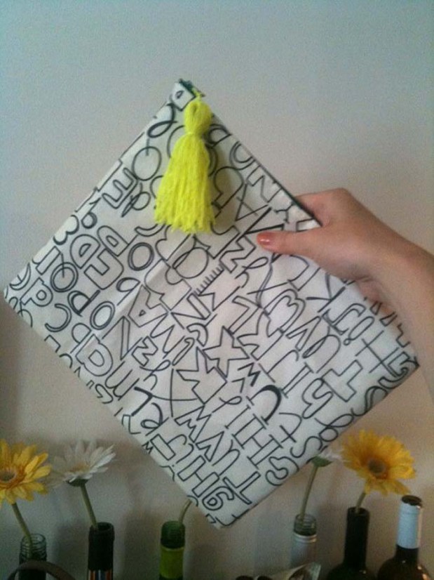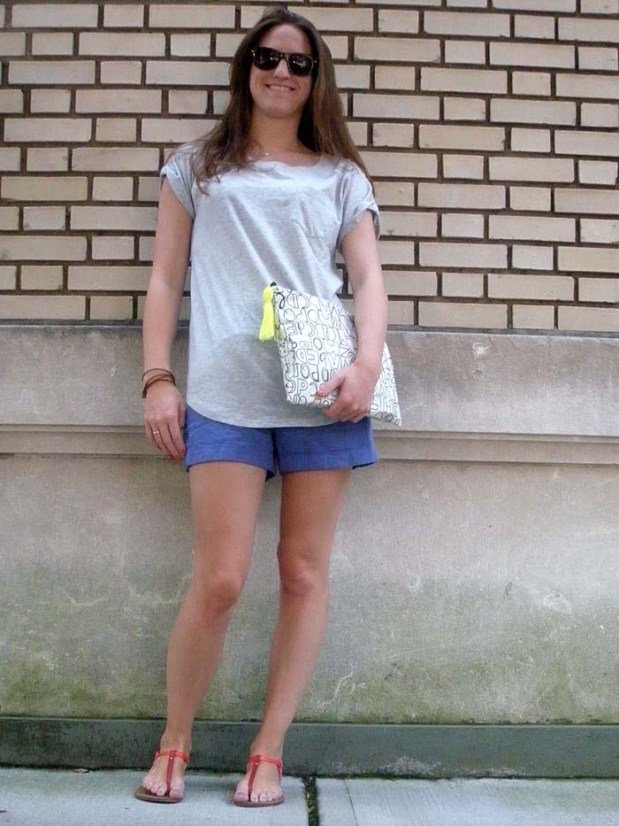 My shoes even got into the spirit of things. Sandals from Target, fantastic gray T-shirt with blue and yellow flecks from Uniqlo, shorts from Topshop. Bag I made myself! I’m pretty excited about it. I love the fabric. Not only is it super cute, but it’s oilcloth, which makes it easier to clean. Perfect for a clutch, no?