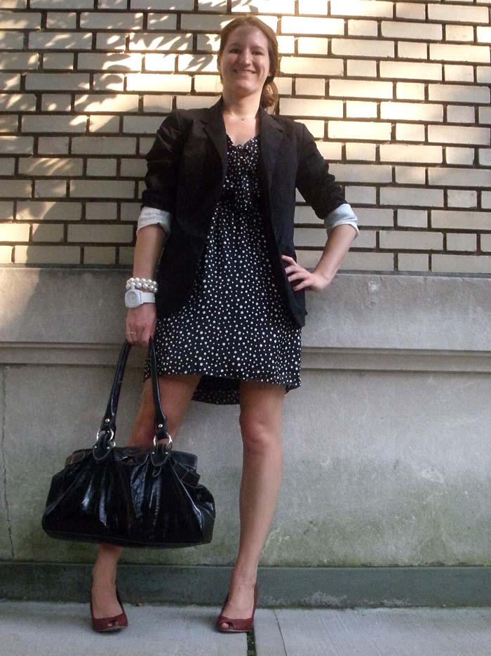 Dress from Marshalls; shoes, blazer, and watch from Target. Purse from a little leather shop in Portugal (that sounds awesome, doesn’t it?).