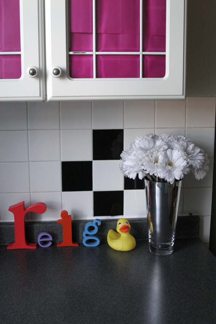 I love that pink liner you put behind the kitchen counter glass. I’ve always thought window-cabinets are completely impractical because it means you have to keep what’s in your kitchen cabinets completely organized, so I really like that you used the windows to add color, but still hide your stuff.