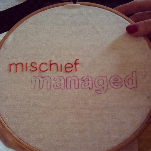 Mischief managed is one of my favorites. The Weasley twins inspire me to focus, go after what I want, and have fun while doing it. After all, they left school with a bang and started their own business! Risk-takers, those two. I also love this quote because it signifies completion of something awesome. I’m nowhere near done with this project, but finishing this quote brought me one step closer.