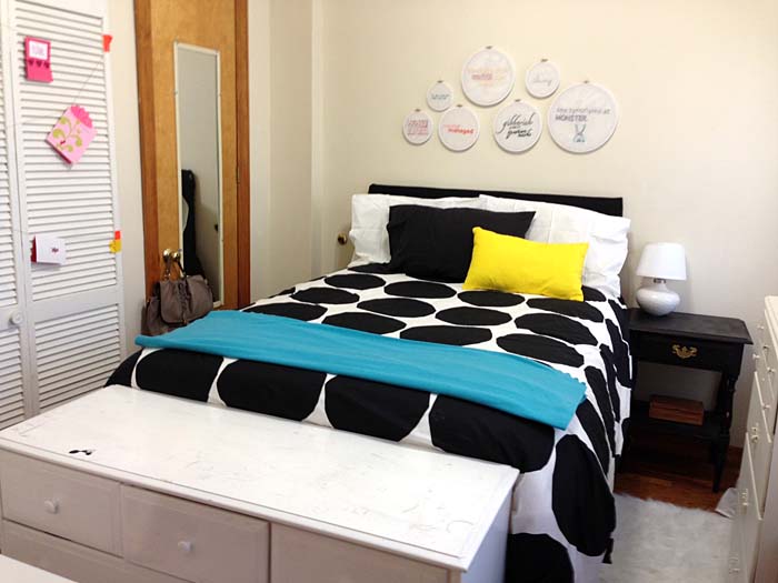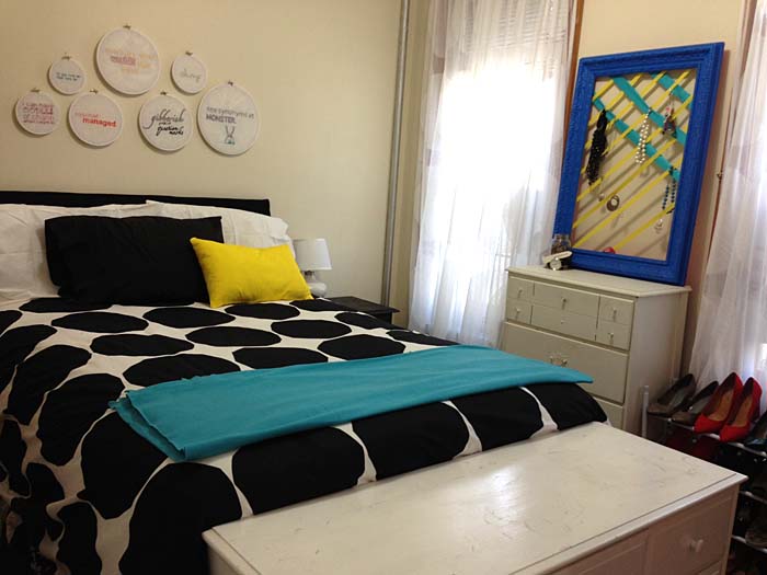 And my bedroom! It was one of the last rooms I worked on but now it’s one of the best places to spend time. I love the bedding and another handmade pillow case. I love the diy jewelry display. And you know I love the embroidery display.