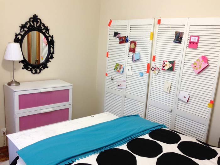 I have some old screens that I used to separate areas in my last studio apartment. Now I use them to display cards I have received. I put some of the same hot pink paper from my kitchen cabinets into the windows of my Ikea dresser. That mirror is from Ikea, too, and I love how it’s (at least a little) ornate.