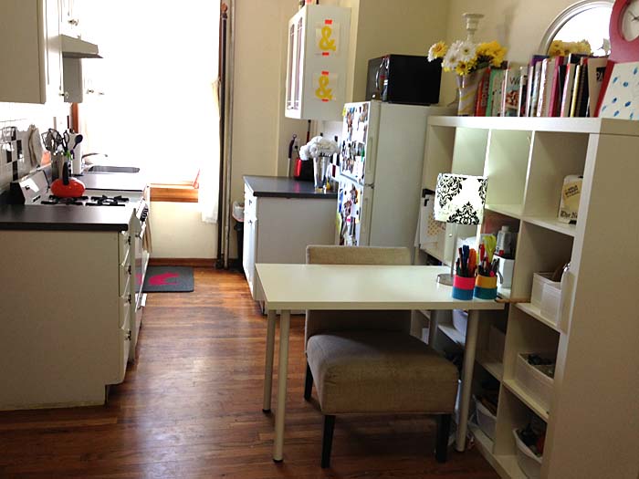 My kitchen is one of the biggest areas in my apartment. I love having the bookshelf and table over there so I can use that area more.