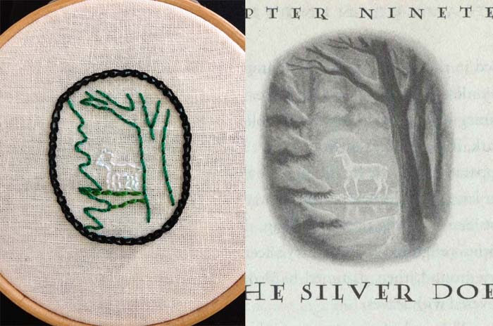 I did something a little different for today’s embroidery. For those of us who grew up with Harry Potter, a charming part of those books were the illustrations in the American version at the top of each chapter. I had a small embroidery hoop lying around that was really the perfect size to fit the drawings at the top of the page–just a few inches across. So I took my paperback of Harry Potter and the Deathly Hallows, and picked one of my favorite illustrations. And using the back stitch and Sublime Stitching’s tutorial for the chain stitch, this is what I came up with!