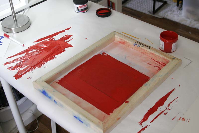 Then I attached my stencil to my screen and got started. I used red for Rocket, of course. Once I had a few bikes printed I spread them out to dry.