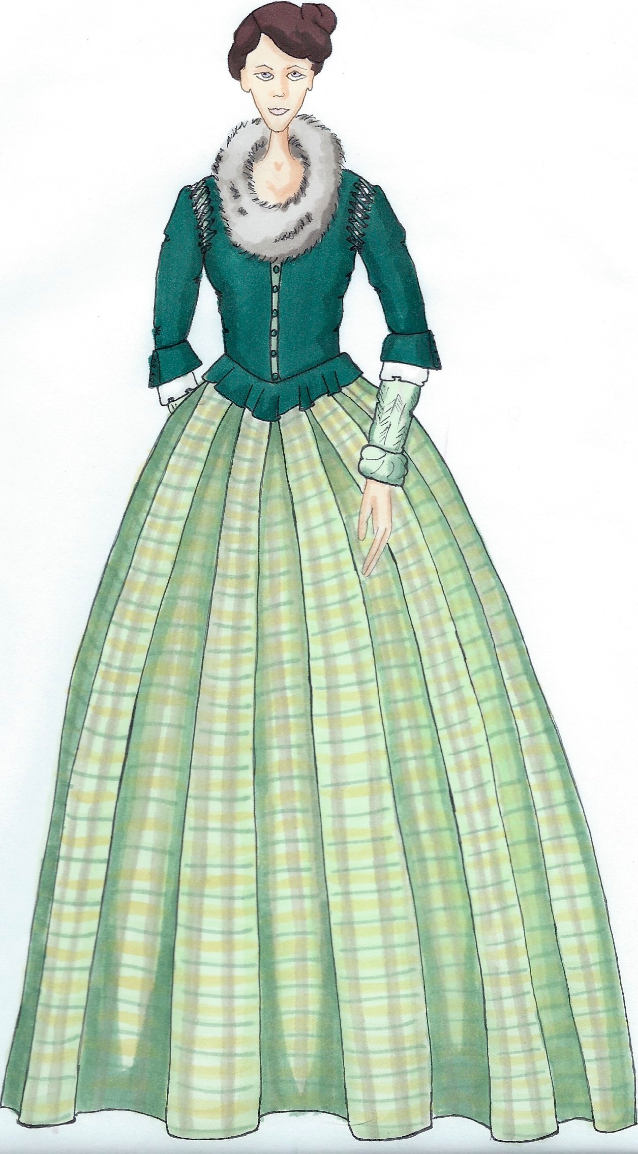 Terry Dresbach, the shows costume designer, talks here about eight of her favorite looks on the show. Not surprisingly, Claire is on that list four times. I drew her in one of my favorite looks of hers, a gorgeous deep teal bodice and plaid skirt.