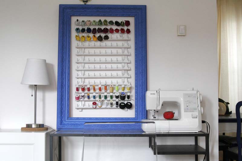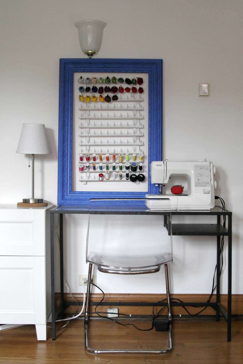 This is my sewing area, which you’ve seen before. I added an embroidery, and of course you can see the lamp and pictures on the wall next to it. It leads to my kitchen and dining area.