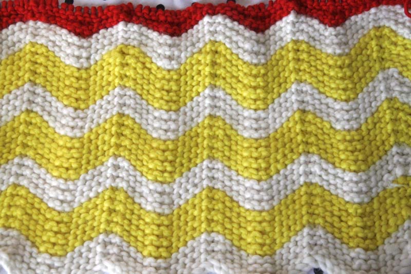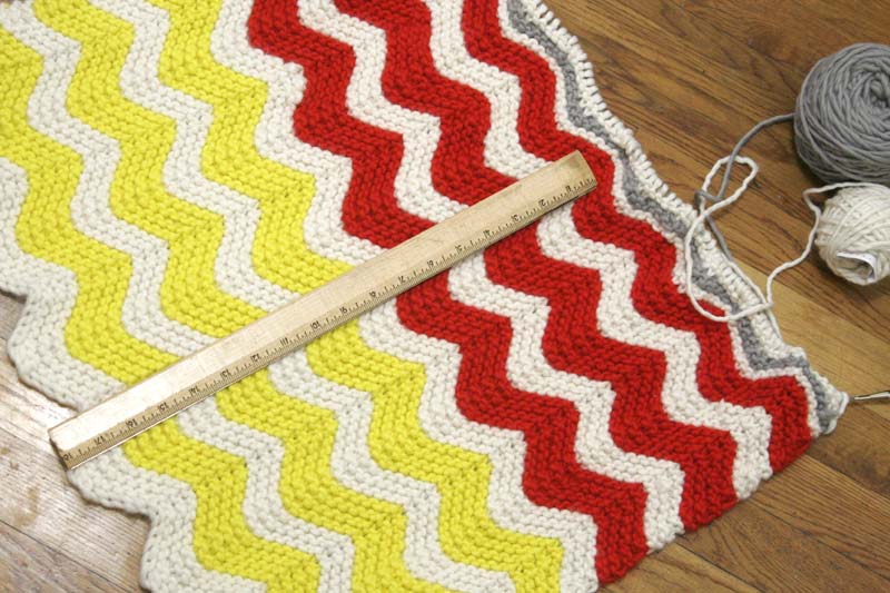 But if I were to make this blanket again, I’d make each color stripe only three garter rows instead of four, and I’d go ahead and buy an extra skein of white yarn from the get-go. So if you’re a loose knitter (which I know now that I am), I’d recommend those modifications. Another thing I learned about knitting loosely is that you’ll end up with a slightly bigger blanket than the pattern indicates. So if you leave out some rows, that would make up some of the difference.
