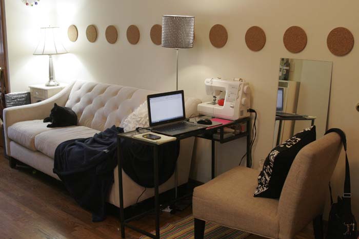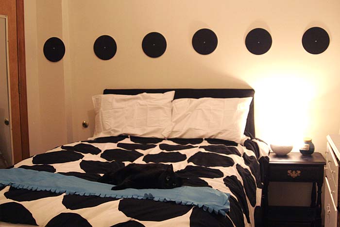 Ideally, I’d love to hang an elaborately framed mirror above the bed, but I got a little skittish about hanging a heavy mirror in my rented apartment and also paying for a mirror. So I saw these very cheap black circle mouse pad and thought, why not? So I echoed what I did in my living room….
