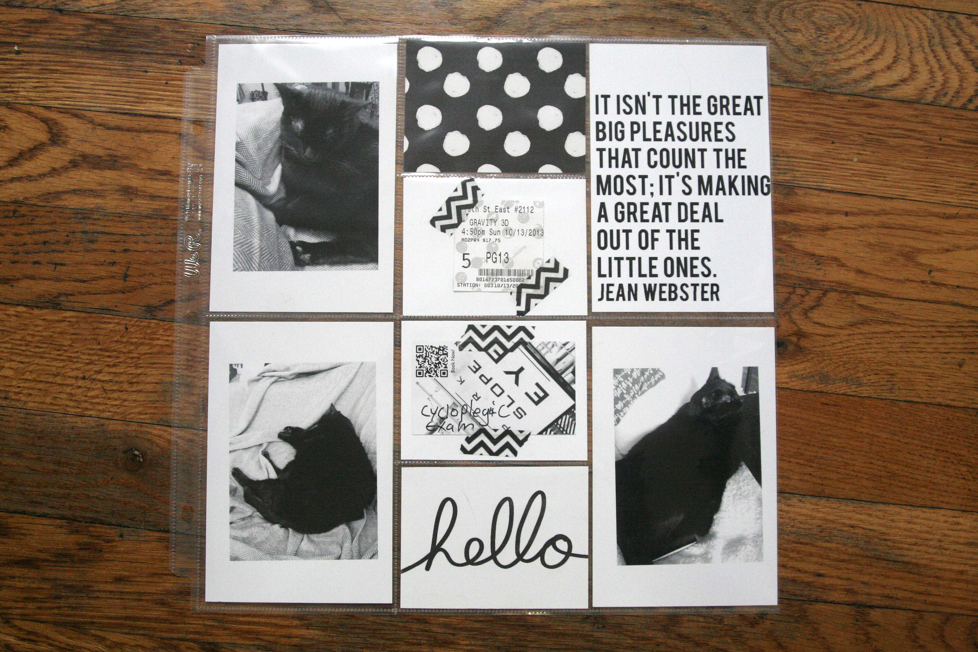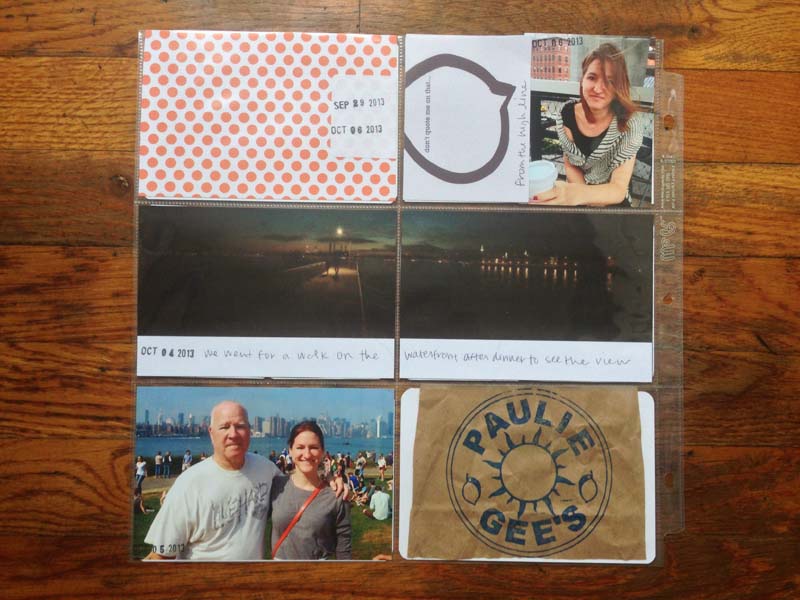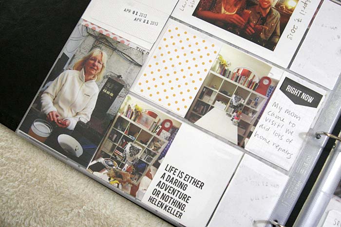 I particularly like how groups of photos and project life cards are paired together and play off each other. My brother’s hand is the same shape of his arms holding her, and her sweet smile is mirrored on the top.
