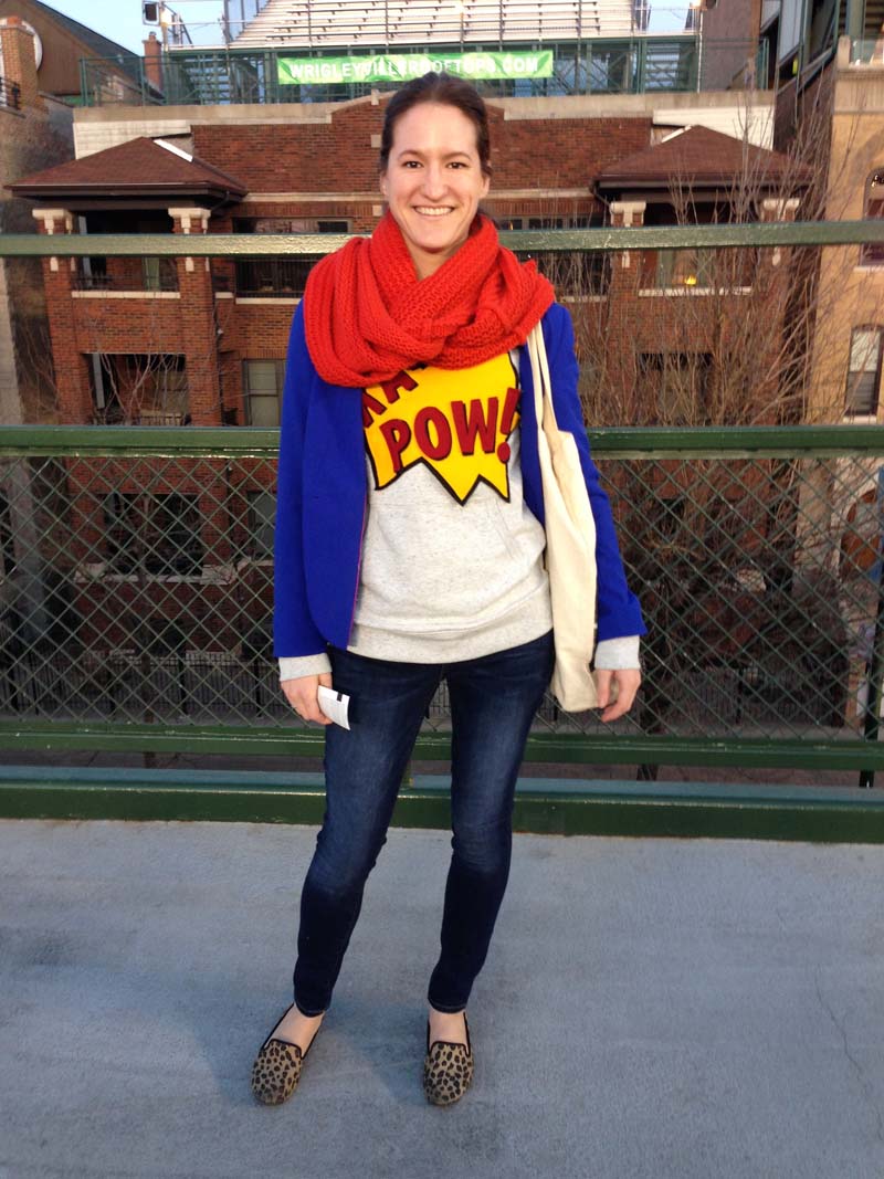 My welcome to Chicago continued with a Cubs game last night. It was so nice out (but yes, a little chilly), and we had so much fun. Wrigley is a quick walk from my apartment, which made a weeknight game really easy to get to and enjoy. The Cubs lost by one to the Pirates, but *I* won because I had a blast. This is what I wore.