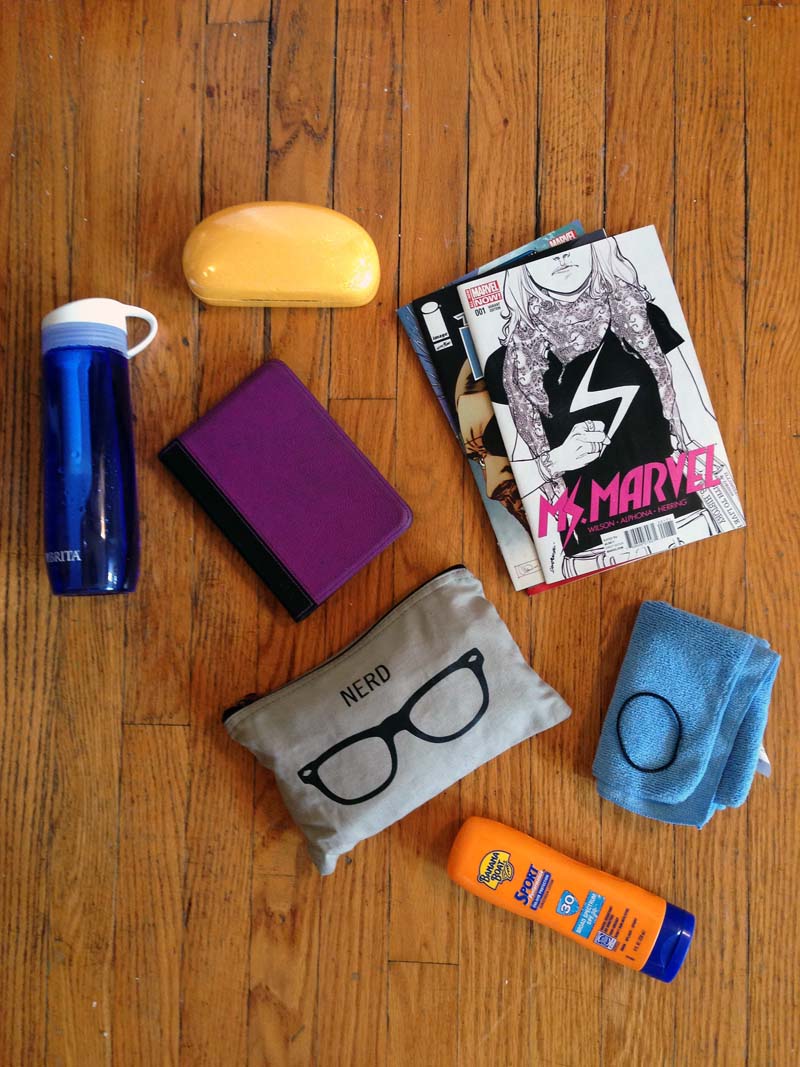I have a water bottle (gotta stay hydrated!), my sunglasses case, my kindle for some heavy reading and comic books for light reading, my nerd pouch (it’s filled with chapstick, money, my phone, and any other small things I might need), my cool microfiber cloth that cleans my glasses, an extra hair elastic, and of course, sunscreen.